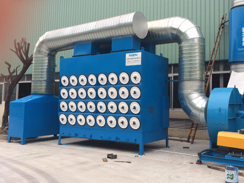 含塵氣體經過入口進入機組,粉塵被阻留在濾筒的表面而被收集,潔凈的氣體通過濾筒中心進入引風機,經消音室由頂部出氣口排出。